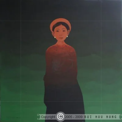 Bùi Hữu Hùng’s paintings are grand in setting yet intimate in likeness. His central theme often features regal women adorned in richly decorated, colourful gowns, their expressions ranging from confidence to languor. These figures exist in an illusory space, unanchored by earth or sky, evoking a dreamlike quality.